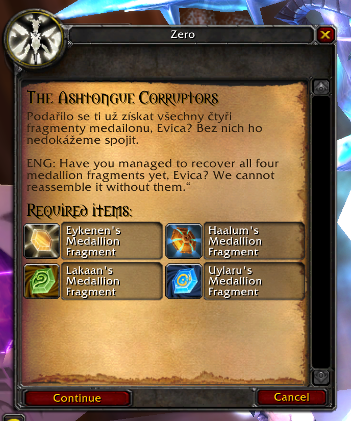Startuje u Zera, přines mu Medallion of Karabor.